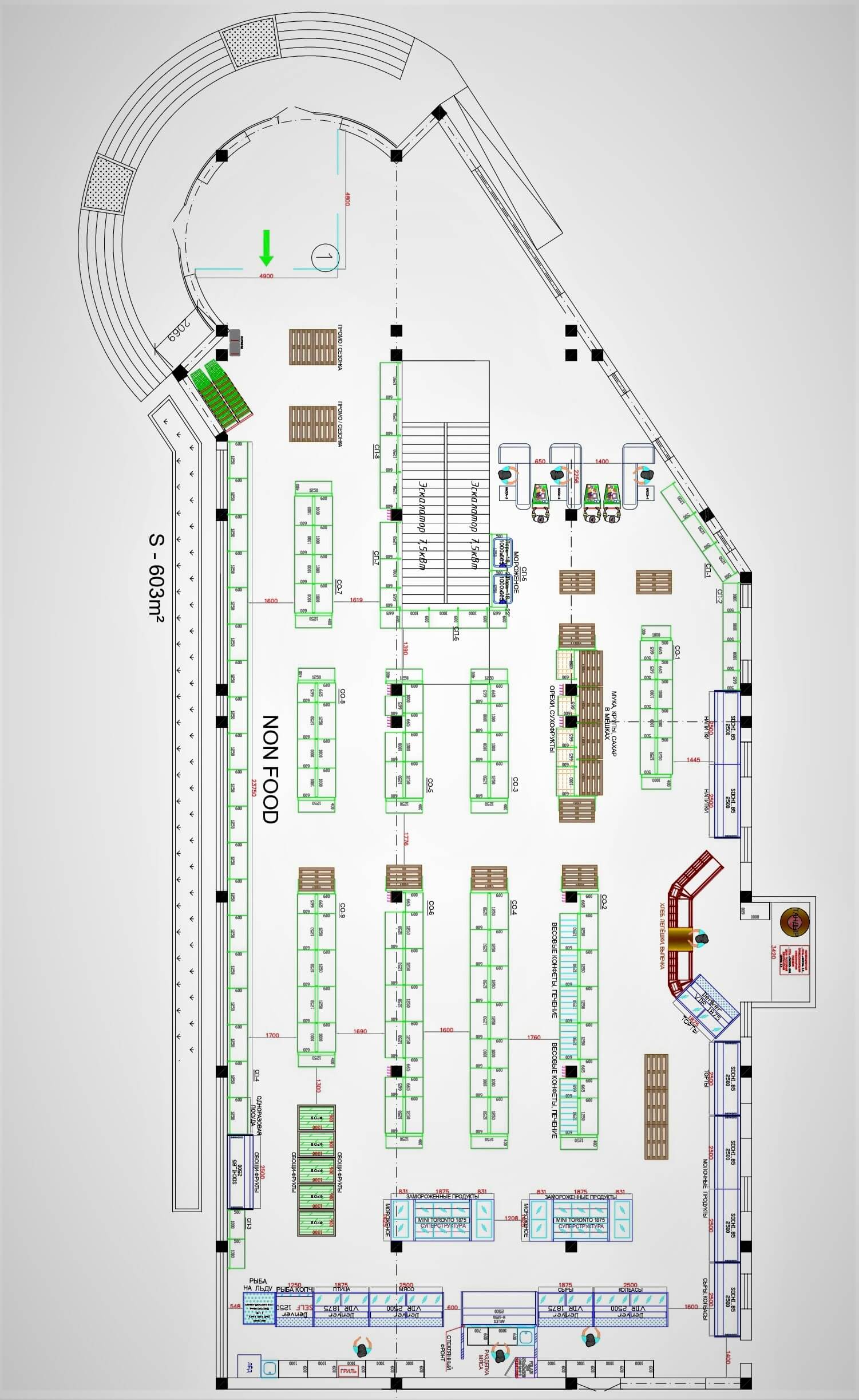 Перед нами стояла задача переделать существующий супермаркет в пригороде Бухары, обеспечив большую насыщенность холодильным оборудованием, а также - сместив акцент с заприлавочной торговли к самообслуживанию, и добавив минипекарню и полноценные рыбный и мясной отделы.